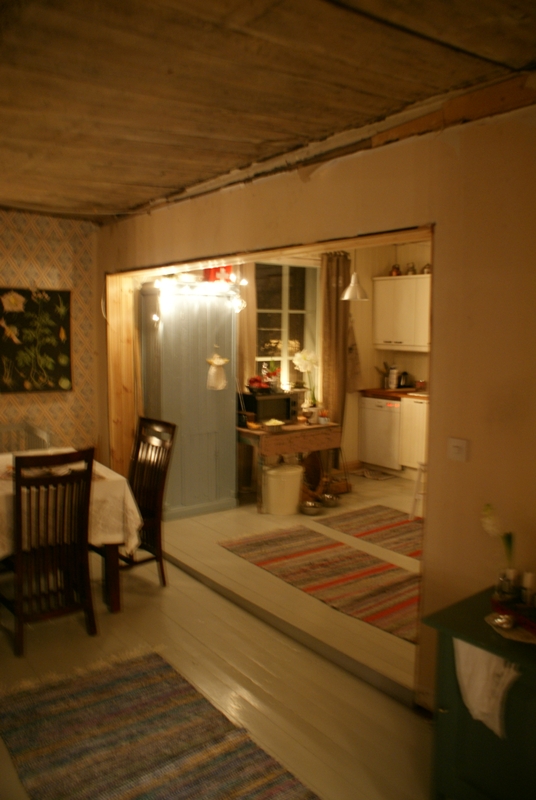 Nyt on löhöilty tarpeeksi (siis minun mielestäni EI Miehen). Niinpä lähdimme eilen panelin hakuun lähikaupungista. Tarkoitus oli ostaa antiikkipanelia ruokailuhuoneeseen mutta eihän sitä tietenkään löytynyt. No, tavallista panelia löytyi ja vihdoin ja viimein tämä projekti edistyi. Tähän entiseen oviaukkoon välihuoneessa, joka paljastui levyjen alta, on tarkoitus vitriini/hyllykkö. Ja tietenkin tuo kammottava muovimatto lähtee myös pois, siellä on alla puulattia. Minä olisin tietenkin innolla senkin repinyt pois mutta Mieheni sanoi, että ensin on saatava nuo edelliset projektit päätökseen... Pöh.